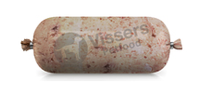 62% spiervlees, 20% bot-/kraakbeen, 15% orgaan (lever/nier/pens/long), 3% vitaminen/mineralenmix, waarvan 1% vit/min en 2% zeewier (kelp).